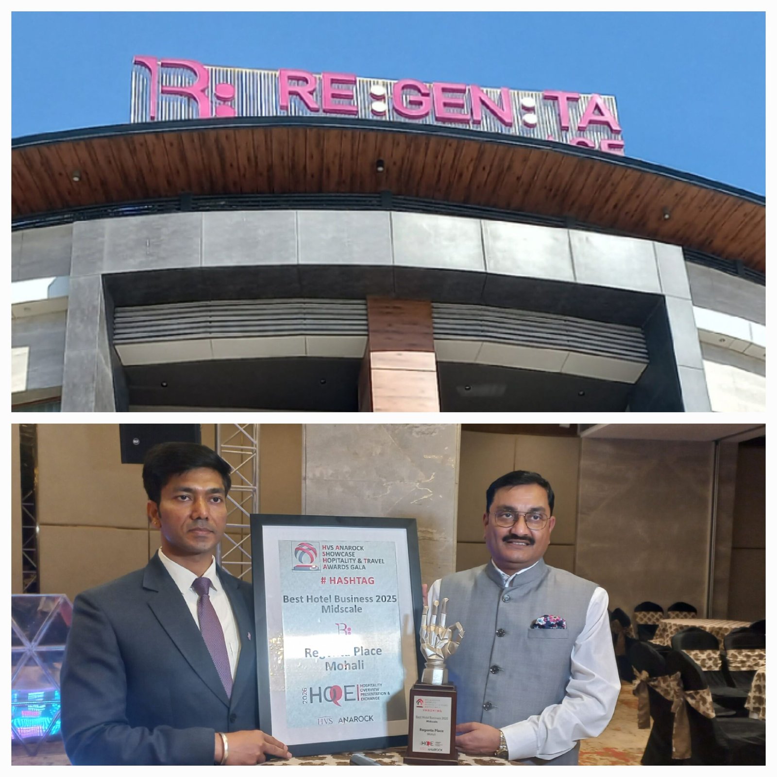 ਰਿਜੈਂਟਾ ਹੋਟਲ ਪਲੇਸ ਮੋਹਾਲੀ ਨੂੰ ਮਿਲਿਆ ‘ਬੈਸਟ ਹੋਟਲ – ਬਿਜ਼ਨਸ 2025 ਮਿੱਡ-ਸਕੇਲ’ ਪੁਰਸਕਾਰ